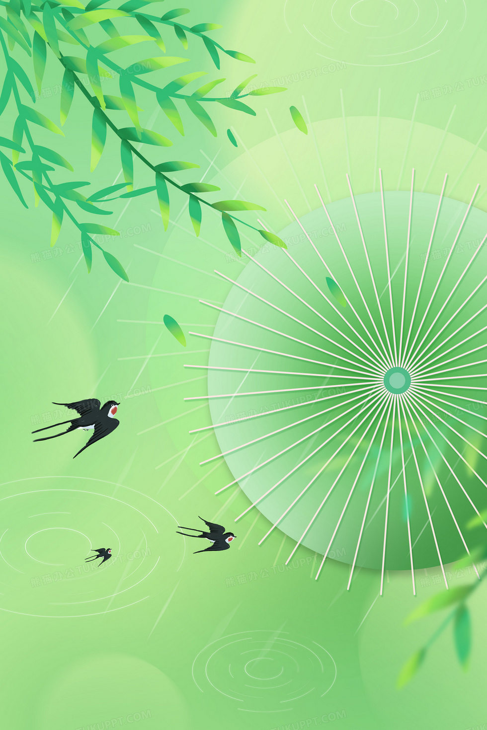 本作品内容为谷雨节气油纸伞绿色背景, 格式为 psd, 大小67 MB, 图片尺寸为3543 x 5314, 作品中背景图片无需修改, 源文件无水印,可以直接使用, 欢迎使用熊猫办公。 如认为平台内容涉嫌侵权,可通过邮件:tousu@tukuppt.com提出书面通知,我们将及时处理。