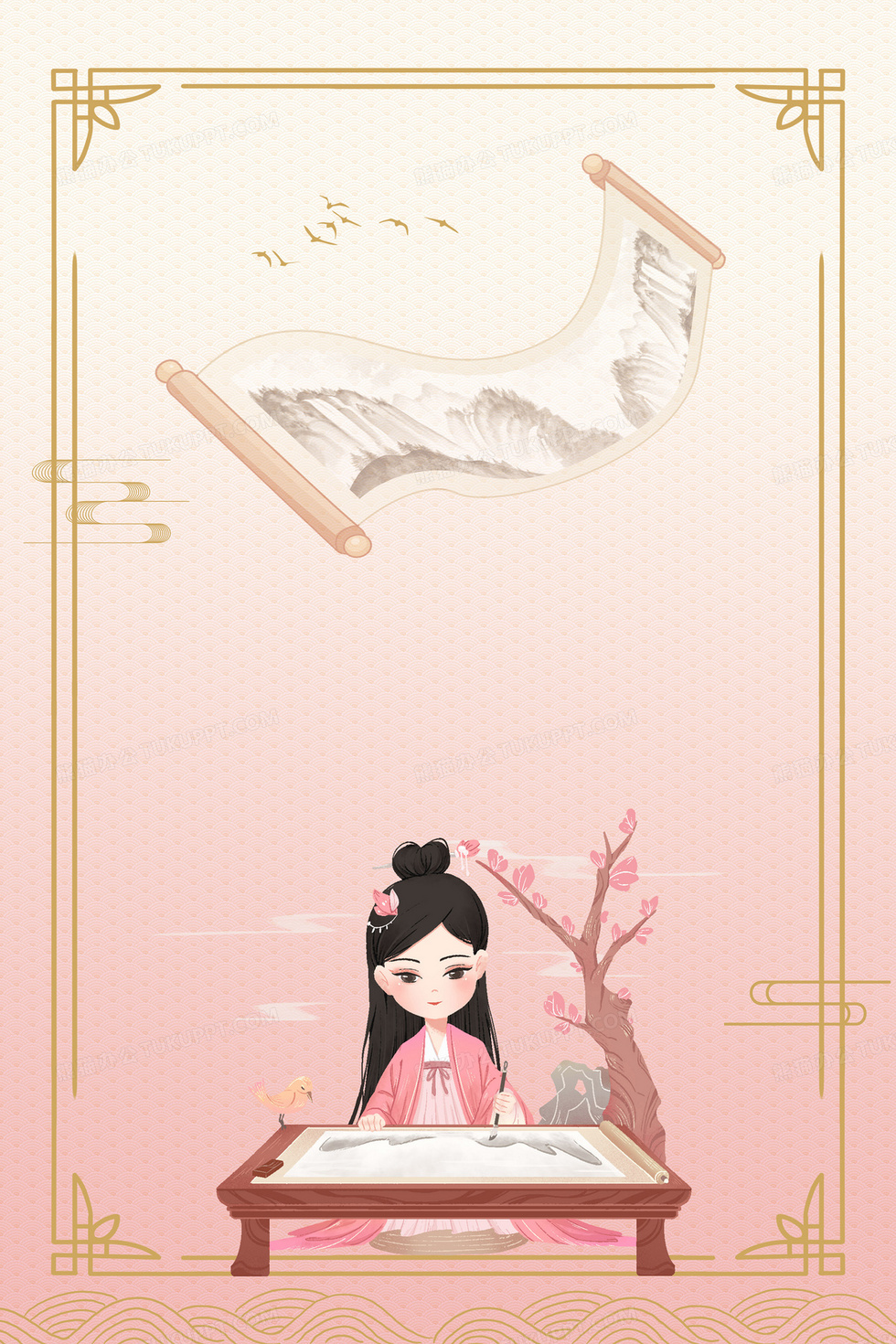 本作品内容为古风琴棋书画之画背景, 格式为 psd, 大小48 MB, 图片尺寸为3543 x 5314, 作品中背景图片无需修改, 源文件无水印,可以直接使用, 欢迎使用熊猫办公。 如认为平台内容涉嫌侵权,可通过邮件:tousu@tukuppt.com提出书面通知,我们将及时处理。