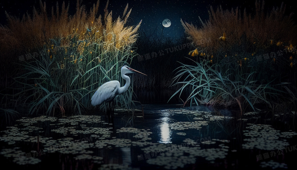 本作品内容为白鹭伫立湖面夜晚风景插画, 格式为 jpg, 大小6 MB, 图片尺寸为2688 x 1536, 源文件无水印, 欢迎使用熊猫办公。 如认为平台内容涉嫌侵权,可通过邮件:tousu@tukuppt.com提出书面通知,我们将及时处理。