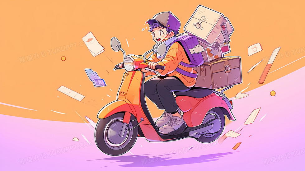 本作品内容为一个骑着摩托车送货的快递员插画, 格式为 jpg, 大小2 MB, 图片尺寸为2912 x 1632, 源文件无水印, 欢迎使用熊猫办公。 如认为平台内容涉嫌侵权,可通过邮件:tousu@tukuppt.com提出书面通知,我们将及时处理。