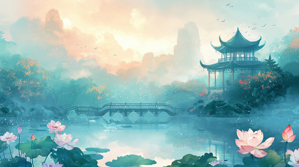 本作品内容为唯美中国风荷花湖心亭插画, 格式为 jpg, 大小3 MB, 图片尺寸为2912 x 1632, 源文件无水印, 欢迎使用熊猫办公。 如认为平台内容涉嫌侵权,可通过邮件:tousu@tukuppt.com提出书面通知,我们将及时处理。