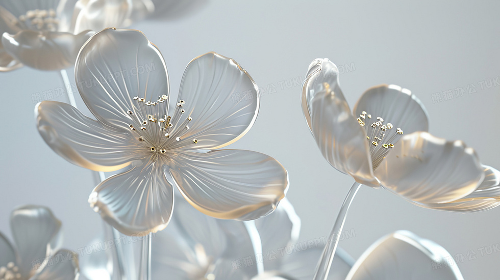 本作品内容为白色玻璃质感晶莹剔透盛开的花朵插画, 格式为 jpg, 大小2 MB, 图片尺寸为2912 x 1632, 源文件无水印, 欢迎使用熊猫办公。 如认为平台内容涉嫌侵权,可通过邮件:tousu@tukuppt.com提出书面通知,我们将及时处理。