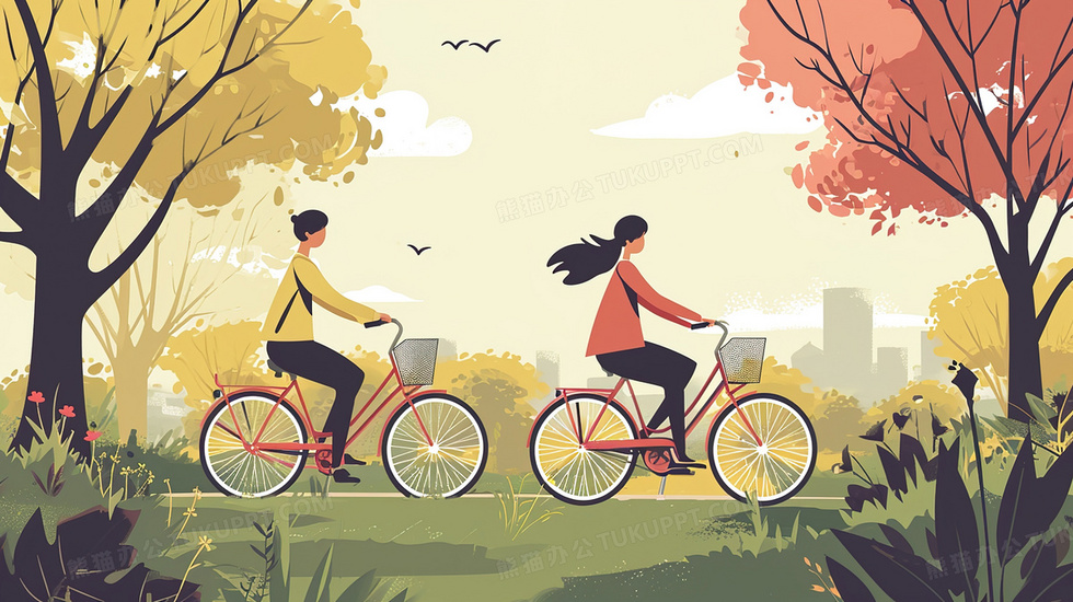 本作品内容为公园里骑自行车的两个人插画, 格式为 jpg, 大小3 MB, 图片尺寸为2912 x 1632, 源文件无水印, 欢迎使用熊猫办公。 如认为平台内容涉嫌侵权,可通过邮件:tousu@tukuppt.com提出书面通知,我们将及时处理。