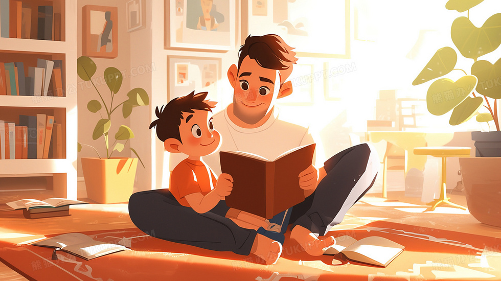 本作品内容为爸爸陪伴小男孩看书插画, 格式为 jpg, 大小2 MB, 图片尺寸为2912 x 1632, 源文件无水印, 欢迎使用熊猫办公。 如认为平台内容涉嫌侵权,可通过邮件:tousu@tukuppt.com提出书面通知,我们将及时处理。