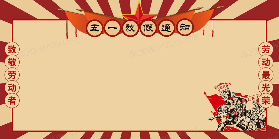 本作品内容为复古横版五一放假通知背景, 格式为 psd, 大小5 MB, 图片尺寸为4724 x 2362, 作品中背景图片无需修改, 源文件无水印,可以直接使用, 欢迎使用熊猫办公。 如认为平台内容涉嫌侵权,可通过邮件:tousu@tukuppt.com提出书面通知,我们将及时处理。