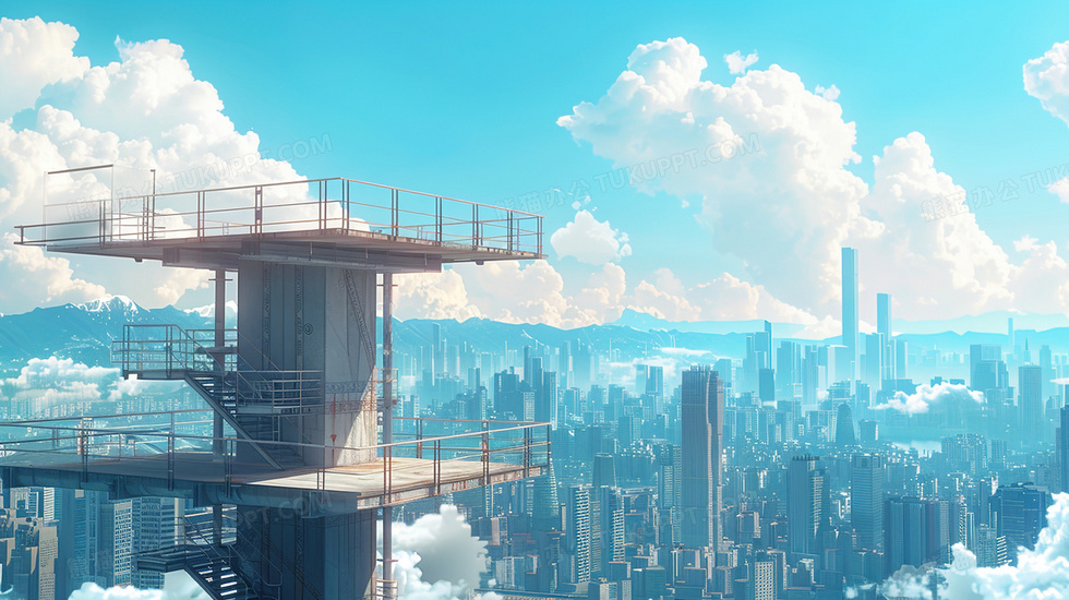 本作品内容为蓝天白云城市看台插画, 格式为 jpg, 大小3 MB, 图片尺寸为2912 x 1632, 源文件无水印, 欢迎使用熊猫办公。 如认为平台内容涉嫌侵权,可通过邮件:tousu@tukuppt.com提出书面通知,我们将及时处理。