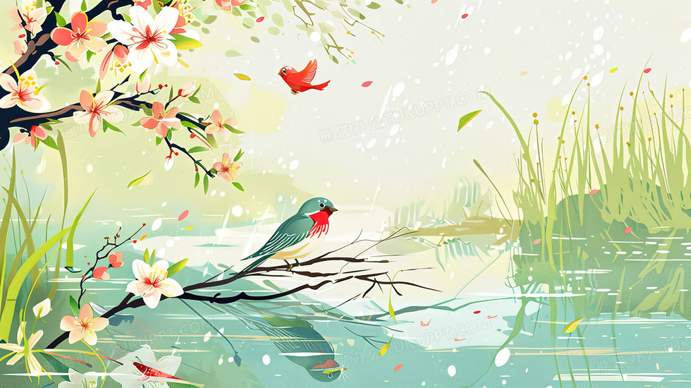 本作品内容为春季节气谷雨自然风景插画, 格式为 jpg, 大小3 MB, 图片尺寸为2912 x 1632, 源文件无水印, 欢迎使用熊猫办公。 如认为平台内容涉嫌侵权,可通过邮件:tousu@tukuppt.com提出书面通知,我们将及时处理。