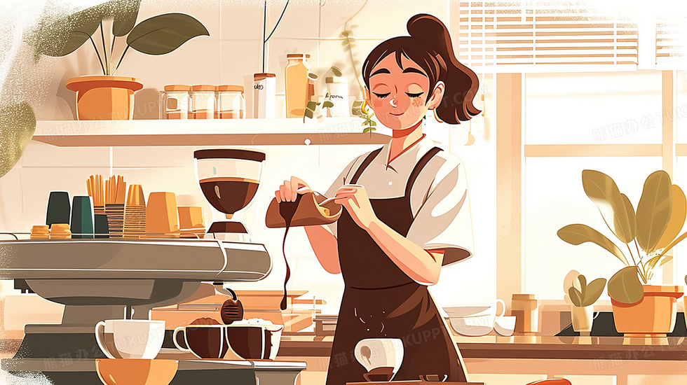 本作品内容为咖啡店制作咖啡的店员插画, 格式为 jpg, 大小2 MB, 图片尺寸为2912 x 1632, 源文件无水印, 欢迎使用熊猫办公。 如认为平台内容涉嫌侵权,可通过邮件:tousu@tukuppt.com提出书面通知,我们将及时处理。