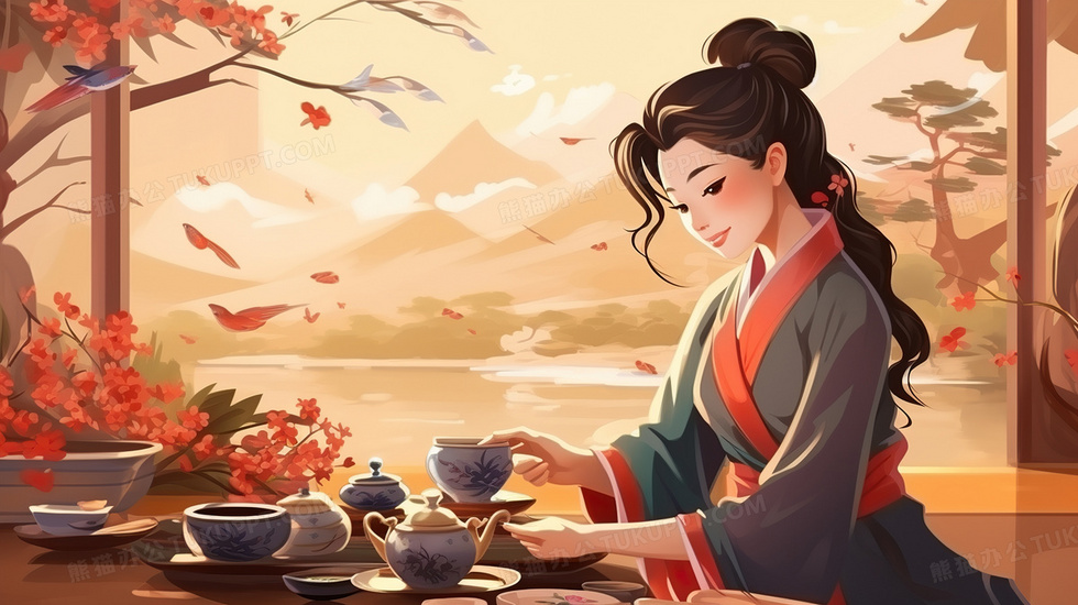 本作品内容为中国风卡通人物泡茶品茶茶文化插画, 格式为 jpg, 大小3 MB, 图片尺寸为2912 x 1632, 源文件无水印, 欢迎使用熊猫办公。 如认为平台内容涉嫌侵权,可通过邮件:tousu@tukuppt.com提出书面通知,我们将及时处理。