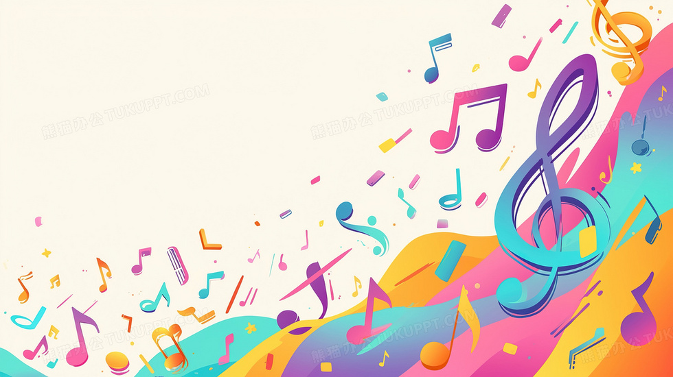 本作品内容为炫彩音乐音符背景, 格式为 jpg, 大小2 MB, 图片尺寸为2912 x 1632, 作品中背景图片无需修改, 源文件无水印,可以直接使用, 欢迎使用熊猫办公。 如认为平台内容涉嫌侵权,可通过邮件:tousu@tukuppt.com提出书面通知,我们将及时处理。