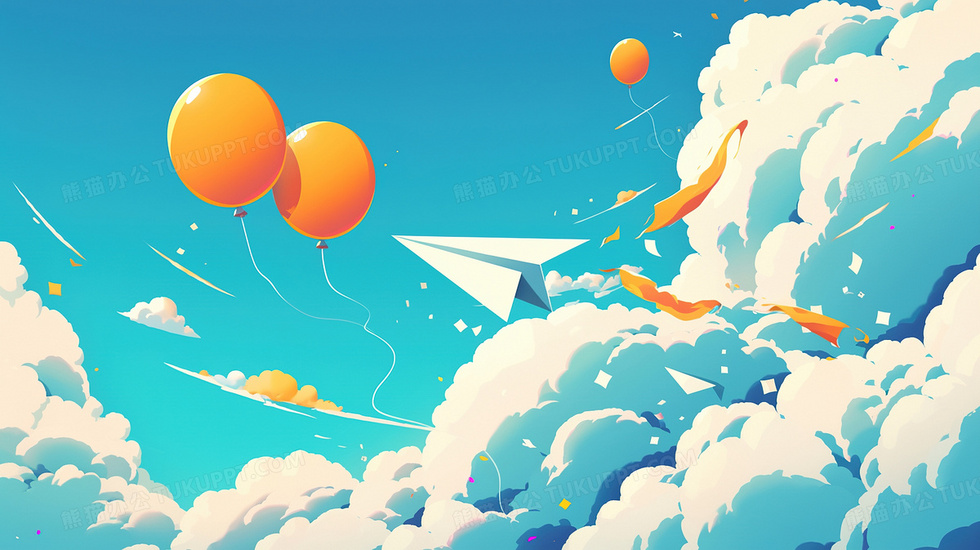 本作品内容为蓝天白云纸飞机气球插画, 格式为 jpg, 大小3 MB, 图片尺寸为2912 x 1632, 源文件无水印, 欢迎使用熊猫办公。 如认为平台内容涉嫌侵权,可通过邮件:tousu@tukuppt.com提出书面通知,我们将及时处理。