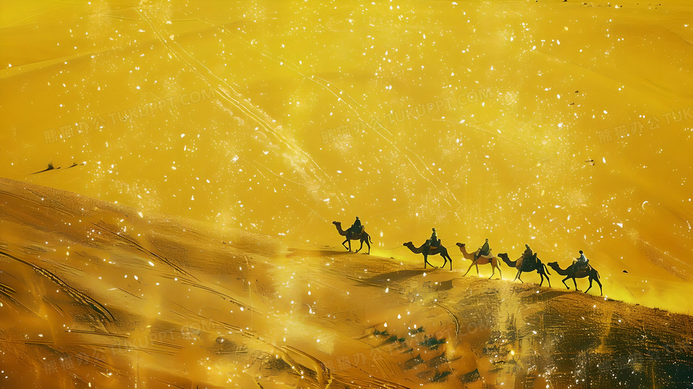 本作品内容为骆驼排成一行缓慢行进在色彩斑斓的黄色闪闪发光的沙漠中背景, 格式为 jpg, 大小4 MB, 图片尺寸为2912 x 1632, 作品中背景图片无需修改, 源文件无水印,可以直接使用, 欢迎使用熊猫办公。 如认为平台内容涉嫌侵权,可通过邮件:tousu@tukuppt.com提出书面通知,我们将及时处理。