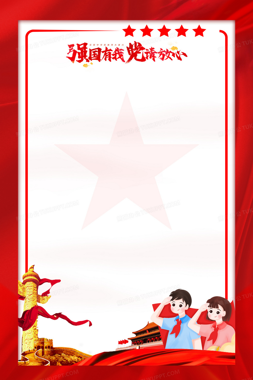 本作品内容为卡通党政少先队员强国有我边框背景, 格式为 psd, 大小186 MB, 图片尺寸为3543 x 5315, 作品中背景图片无需修改, 源文件无水印,可以直接使用, 欢迎使用熊猫办公。 如认为平台内容涉嫌侵权,可通过邮件:tousu@tukuppt.com提出书面通知,我们将及时处理。