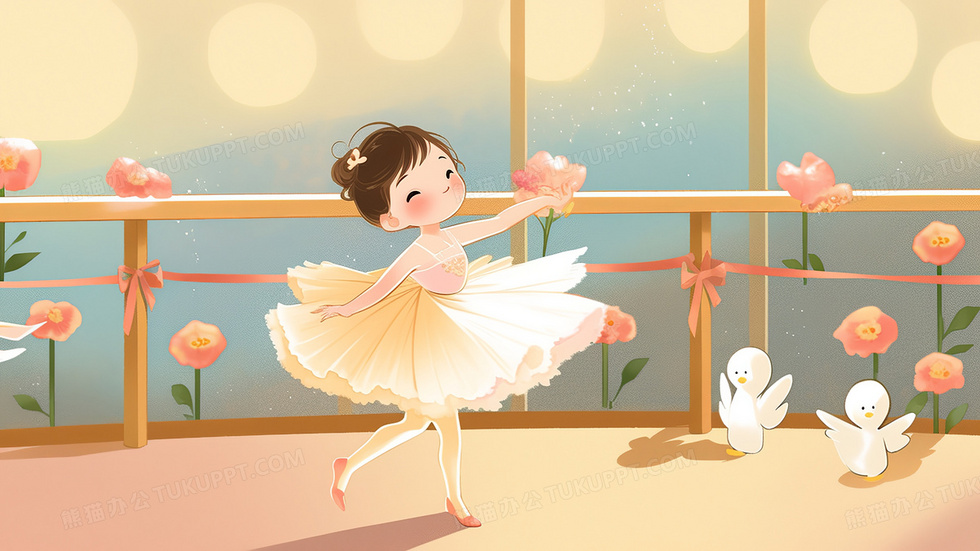 本作品内容为可爱的小女孩在舞蹈教室练习芭蕾舞创意插画, 格式为 jpg, 大小2 MB, 图片尺寸为2432 x 1368, 源文件无水印, 欢迎使用熊猫办公。 如认为平台内容涉嫌侵权,可通过邮件:tousu@tukuppt.com提出书面通知,我们将及时处理。