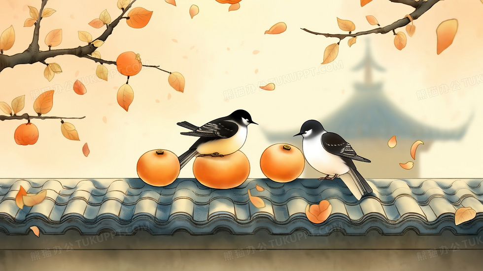 本作品内容为金秋十月屋檐上的柿子与喜鹊插画, 格式为 jpg, 大小2 MB, 图片尺寸为2912 x 1632, 源文件无水印, 欢迎使用熊猫办公。 如认为平台内容涉嫌侵权,可通过邮件:tousu@tukuppt.com提出书面通知,我们将及时处理。