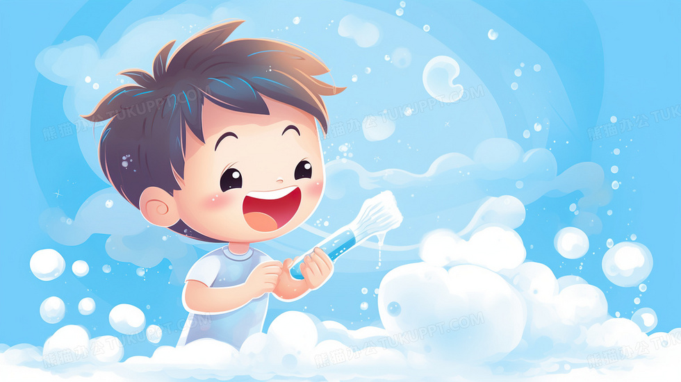 本作品内容为蓝色卡通小孩刷牙玩耍场景创意插画, 格式为 jpg, 大小4 MB, 图片尺寸为2912 x 1632, 源文件无水印, 欢迎使用熊猫办公。 如认为平台内容涉嫌侵权,可通过邮件:tousu@tukuppt.com提出书面通知,我们将及时处理。