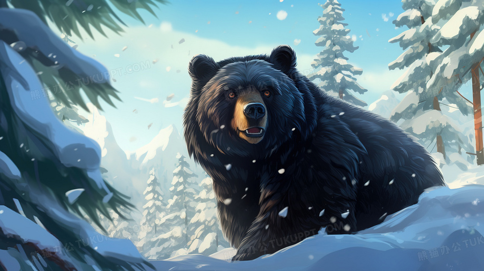 本作品内容为北方树林雪地里体型庞大的黑熊插画, 格式为 jpg, 大小5 MB, 图片尺寸为2912 x 1632, 源文件无水印, 欢迎使用熊猫办公。 如认为平台内容涉嫌侵权,可通过邮件:tousu@tukuppt.com提出书面通知,我们将及时处理。