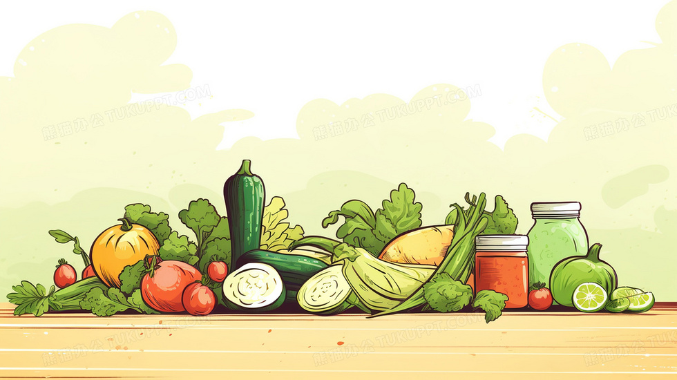 本作品内容为绿色蔬菜瓜果食材素食日插画, 格式为 jpg, 大小4 MB, 图片尺寸为2912 x 1632, 源文件无水印, 欢迎使用熊猫办公。 如认为平台内容涉嫌侵权,可通过邮件:tousu@tukuppt.com提出书面通知,我们将及时处理。