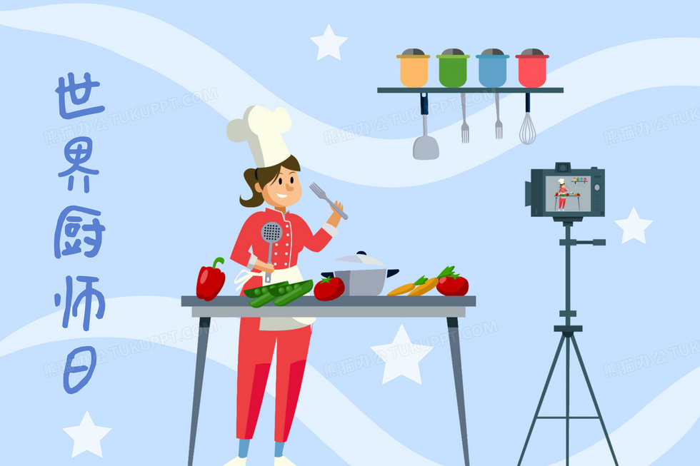 本作品内容为世界厨师日女厨师现场直播插画, 格式为 psd, 大小2 MB, 请使用软件PhotoShop(CC)打开, 源文件无水印, 欢迎使用熊猫办公。 如认为平台内容涉嫌侵权,可通过邮件:tousu@tukuppt.com提出书面通知,我们将及时处理。