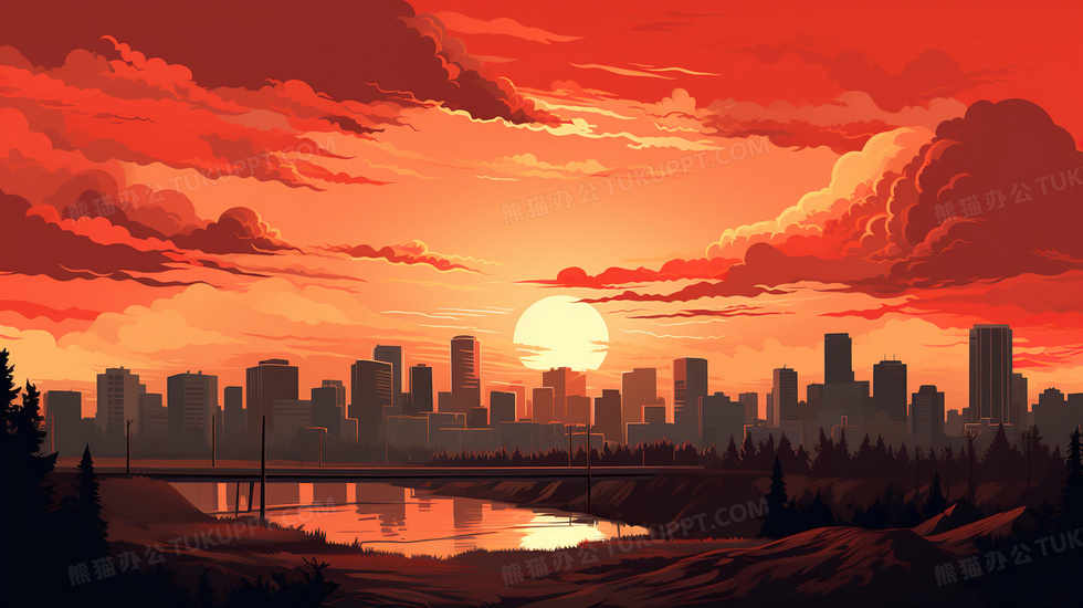 本作品内容为唯美城市夕阳落日风景插画, 格式为 jpg, 大小5 MB, 图片尺寸为2912 x 1632, 源文件无水印, 欢迎使用熊猫办公。 如认为平台内容涉嫌侵权,可通过邮件:tousu@tukuppt.com提出书面通知,我们将及时处理。