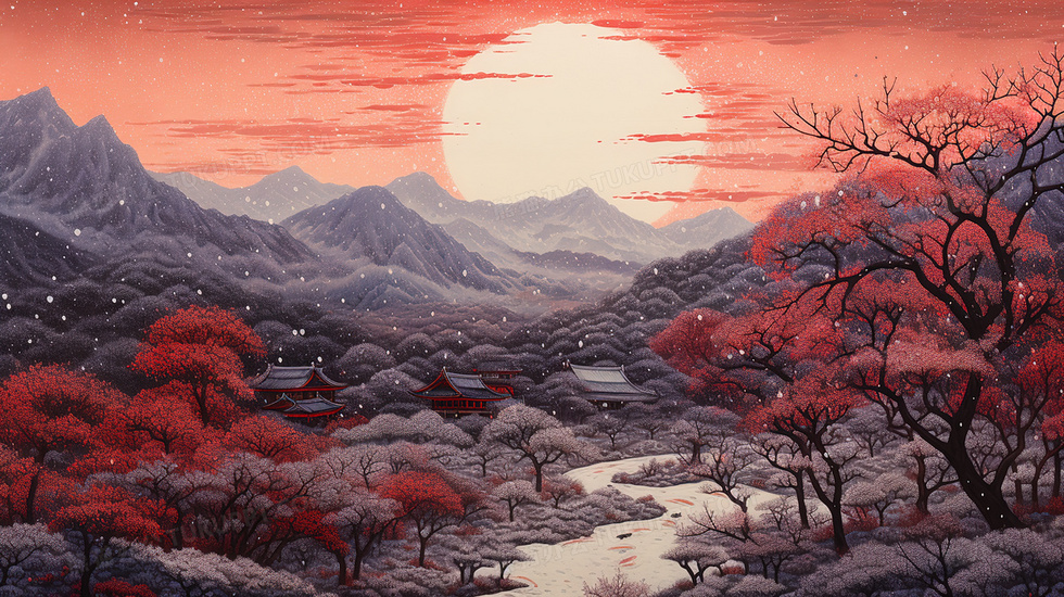 本作品内容为中国风雪中山水风景红色树木建筑插画, 格式为 jpg, 大小9 MB, 图片尺寸为2912 x 1632, 源文件无水印, 欢迎使用熊猫办公。 如认为平台内容涉嫌侵权,可通过邮件:tousu@tukuppt.com提出书面通知,我们将及时处理。