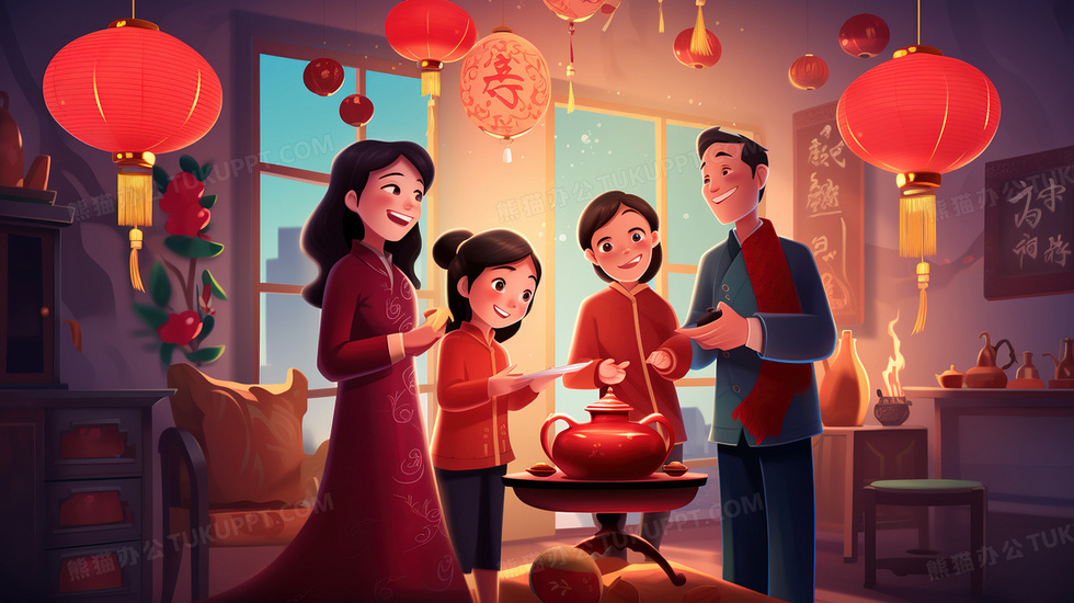本作品内容为春节庆典里温馨的一家四口插画, 格式为 jpg, 大小5 MB, 图片尺寸为2912 x 1632, 源文件无水印, 欢迎使用熊猫办公。 如认为平台内容涉嫌侵权,可通过邮件:tousu@tukuppt.com提出书面通知,我们将及时处理。