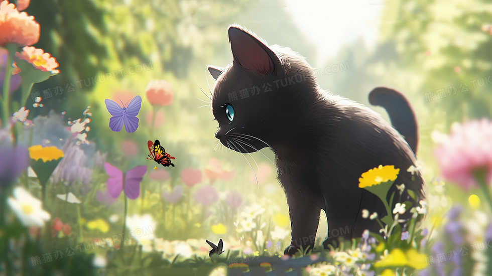 本作品内容为可爱的小猫在花丛中被蝴蝶吸引创意插画, 格式为 jpg, 大小6 MB, 图片尺寸为2912 x 1632, 源文件无水印, 欢迎使用熊猫办公。 如认为平台内容涉嫌侵权,可通过邮件:tousu@tukuppt.com提出书面通知,我们将及时处理。