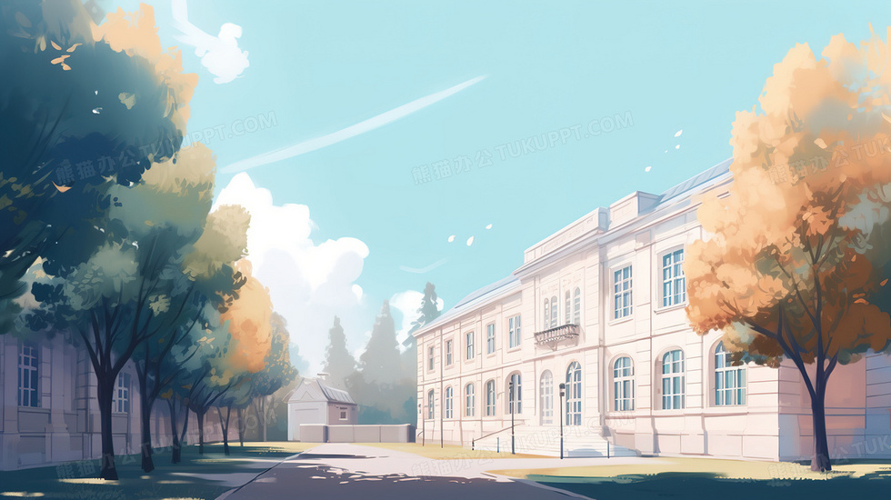 本作品内容为卡通校园建筑风景插画, 格式为 jpg, 大小5 MB, 图片尺寸为2912 x 1632, 源文件无水印, 欢迎使用熊猫办公。 如认为平台内容涉嫌侵权,可通过邮件:tousu@tukuppt.com提出书面通知,我们将及时处理。