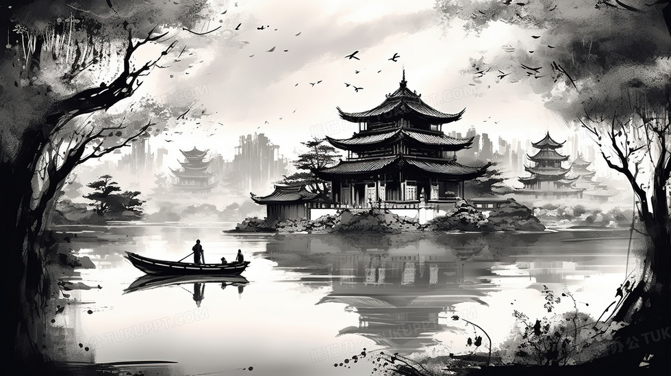 本作品内容为中国风山水风景黑白水墨插画, 格式为 jpg, 大小8 MB, 图片尺寸为2912 x 1632, 源文件无水印, 欢迎使用熊猫办公。 如认为平台内容涉嫌侵权,可通过邮件:tousu@tukuppt.com提出书面通知,我们将及时处理。