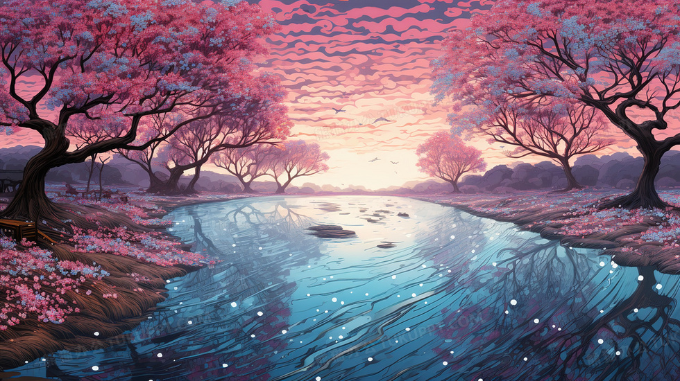 本作品内容为春季河边粉色花树风景肌理感插画, 格式为 jpg, 大小8 MB, 图片尺寸为2912 x 1632, 源文件无水印, 欢迎使用熊猫办公。 如认为平台内容涉嫌侵权,可通过邮件:tousu@tukuppt.com提出书面通知,我们将及时处理。