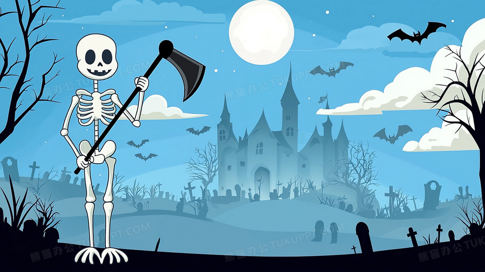 本作品内容为夜晚古堡手拿斧头的骷髅人插画, 格式为 jpg, 大小2 MB, 图片尺寸为2912 x 1632, 源文件无水印, 欢迎使用熊猫办公。 如认为平台内容涉嫌侵权,可通过邮件:tousu@tukuppt.com提出书面通知,我们将及时处理。