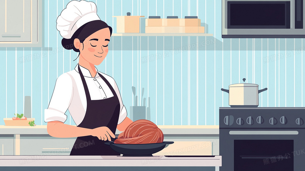 本作品内容为女厨师做饭烹饪美食插画, 格式为 jpg, 大小2 MB, 图片尺寸为2912 x 1632, 源文件无水印, 欢迎使用熊猫办公。 如认为平台内容涉嫌侵权,可通过邮件:tousu@tukuppt.com提出书面通知,我们将及时处理。