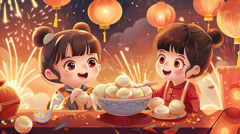 本作品内容为两个小朋友在元宵节吃汤圆卡通插画, 格式为 jpg, 大小3 MB, 图片尺寸为2912 x 1632, 源文件无水印, 欢迎使用熊猫办公。 如认为平台内容涉嫌侵权,可通过邮件:tousu@tukuppt.com提出书面通知,我们将及时处理。