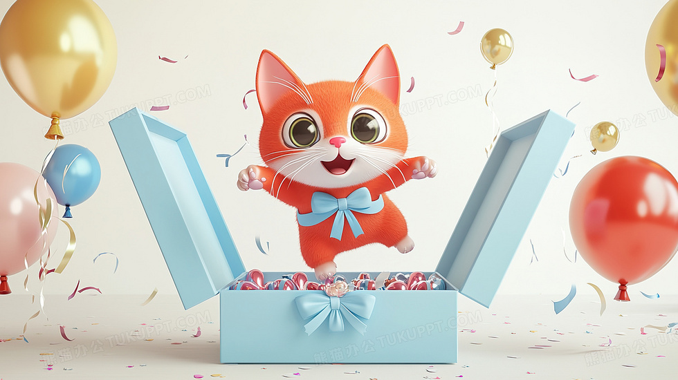 本作品内容为3D生日礼盒蹦跶出来的宠物猫插画, 格式为 jpg, 大小2 MB, 图片尺寸为2912 x 1632, 源文件无水印, 欢迎使用熊猫办公。 如认为平台内容涉嫌侵权,可通过邮件:tousu@tukuppt.com提出书面通知,我们将及时处理。