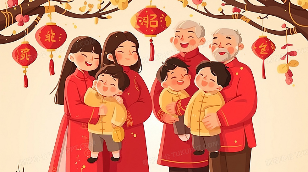 本作品内容为春节抱着小孩拜年的幸福一家人插画, 格式为 jpg, 大小2 MB, 图片尺寸为2912 x 1632, 源文件无水印, 欢迎使用熊猫办公。 如认为平台内容涉嫌侵权,可通过邮件:tousu@tukuppt.com提出书面通知,我们将及时处理。