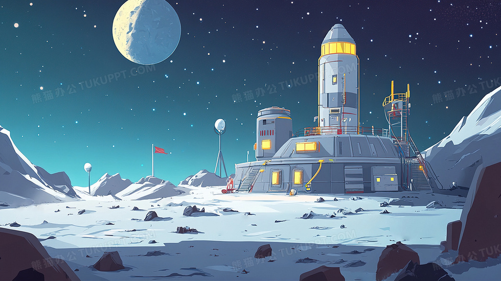 本作品内容为航天登月月球基地基站插画, 格式为 jpg, 大小3 MB, 图片尺寸为2912 x 1632, 源文件无水印, 欢迎使用熊猫办公。 如认为平台内容涉嫌侵权,可通过邮件:tousu@tukuppt.com提出书面通知,我们将及时处理。