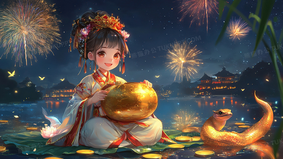 本作品内容为喜庆蛇年荷叶上抱金砖女孩与蛇烟花插画, 格式为 jpg, 大小4 MB, 图片尺寸为2912 x 1632, 源文件无水印, 欢迎使用熊猫办公。 如认为平台内容涉嫌侵权,可通过邮件:tousu@tukuppt.com提出书面通知,我们将及时处理。