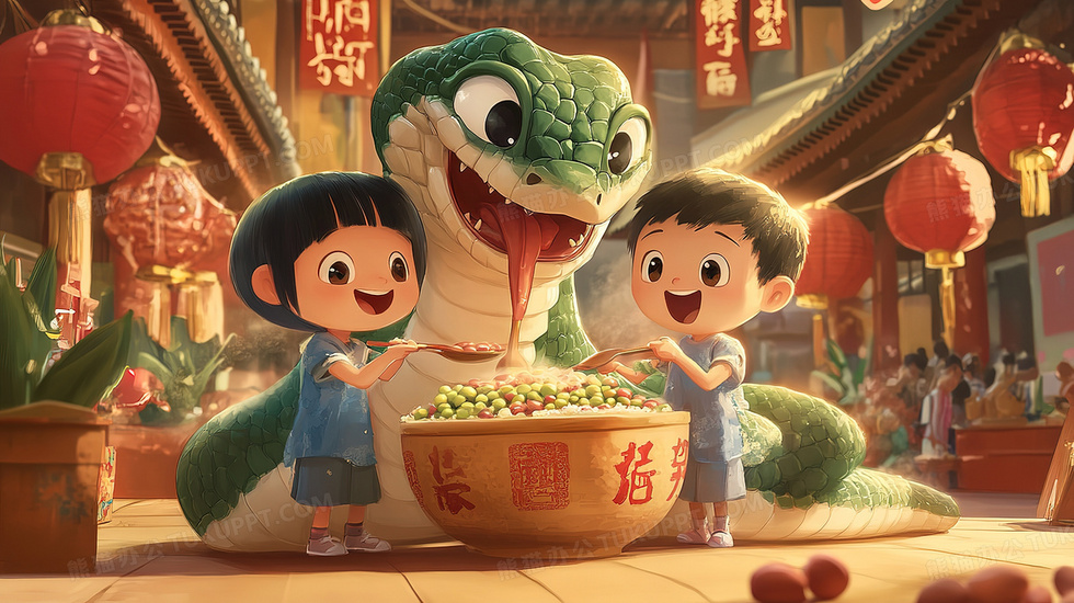 本作品内容为卡通蛇年儿童与青蛇吃腊八粥插画, 格式为 jpg, 大小3 MB, 图片尺寸为2912 x 1632, 源文件无水印, 欢迎使用熊猫办公。 如认为平台内容涉嫌侵权,可通过邮件:tousu@tukuppt.com提出书面通知,我们将及时处理。
