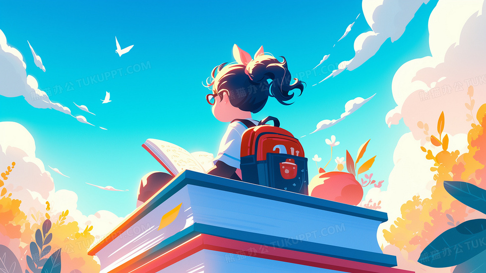 本作品内容为女孩坐在书本上看书创意教育插画, 格式为 jpg, 大小7 MB, 图片尺寸为2912 x 1632, 源文件无水印, 欢迎使用熊猫办公。 如认为平台内容涉嫌侵权,可通过邮件:tousu@tukuppt.com提出书面通知,我们将及时处理。