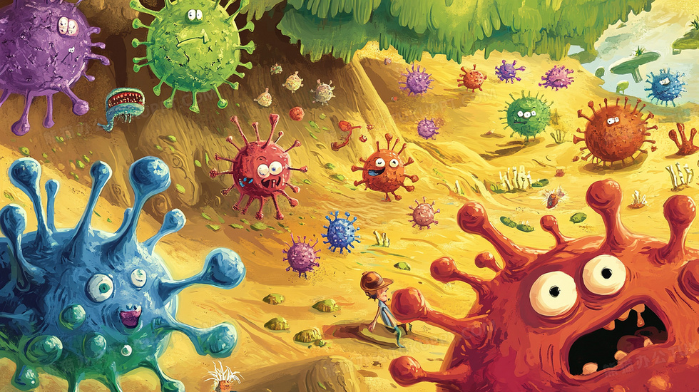首页 > 插画 > 科技艺术 > 水彩手绘 > 创意卡通显微镜下实验室病毒插画