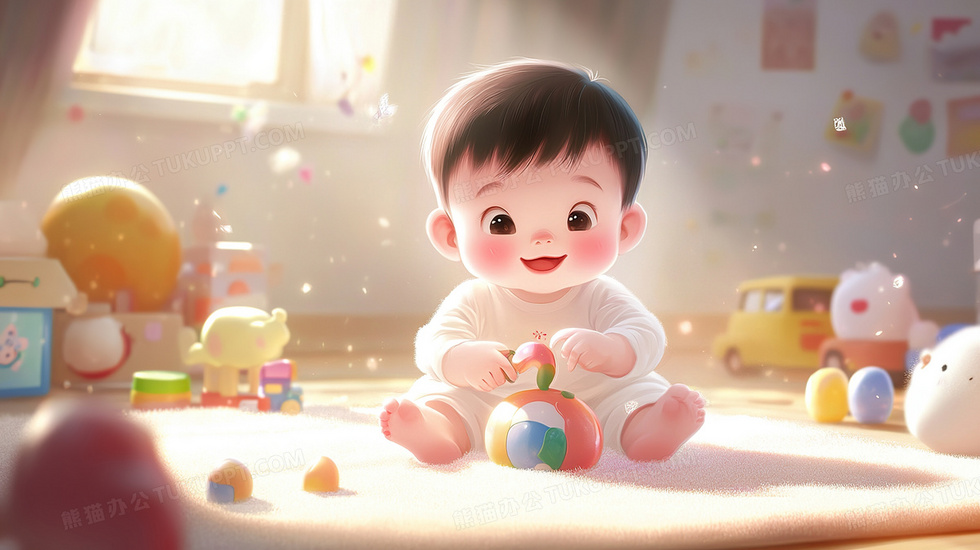 本作品内容为婴儿房玩玩具的小宝宝插画, 格式为 jpg, 大小3 MB, 图片尺寸为2912 x 1632, 源文件无水印, 欢迎使用熊猫办公。 如认为平台内容涉嫌侵权,可通过邮件:tousu@tukuppt.com提出书面通知,我们将及时处理。