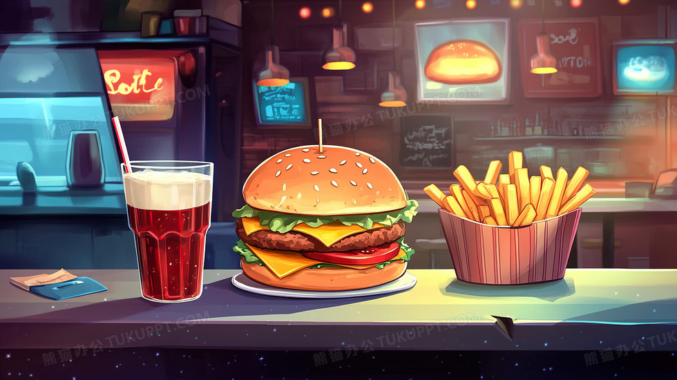 本作品内容为汉堡可乐快餐食物膨化食品插画, 格式为 jpg, 大小3 MB, 图片尺寸为2912 x 1632, 源文件无水印, 欢迎使用熊猫办公。 如认为平台内容涉嫌侵权,可通过邮件:tousu@tukuppt.com提出书面通知,我们将及时处理。