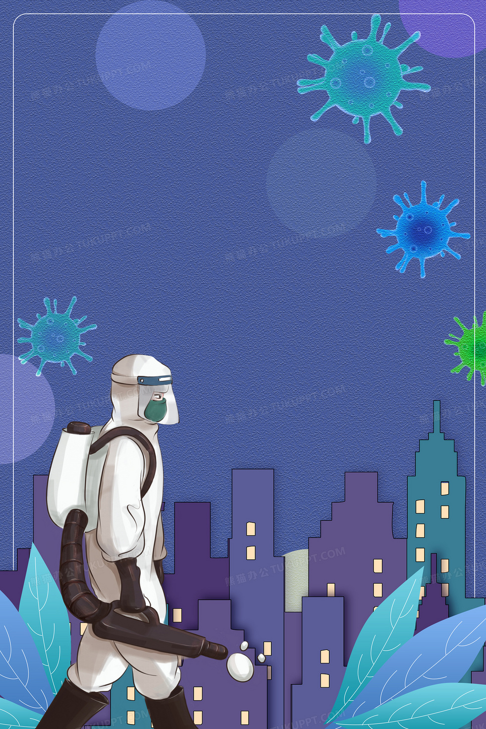 本作品内容为抗击肺炎卡通消灭病毒背景, 格式为 psd, 大小46 MB, 图片尺寸为3543 x 5315, 作品中背景图片无需修改, 源文件无水印,可以直接使用, 欢迎使用熊猫办公。 如认为平台内容涉嫌侵权,可通过邮件:tousu@tukuppt.com提出书面通知,我们将及时处理。