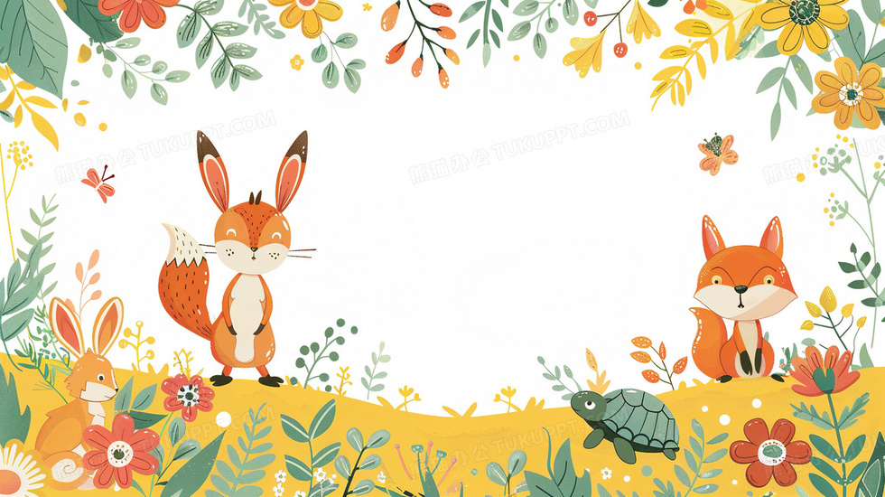 本作品内容为可爱狐狸卡通动物边框背景, 格式为 jpg, 大小3 MB, 图片尺寸为2912 x 1632, 作品中背景图片无需修改, 源文件无水印,可以直接使用, 欢迎使用熊猫办公。 如认为平台内容涉嫌侵权,可通过邮件:tousu@tukuppt.com提出书面通知,我们将及时处理。