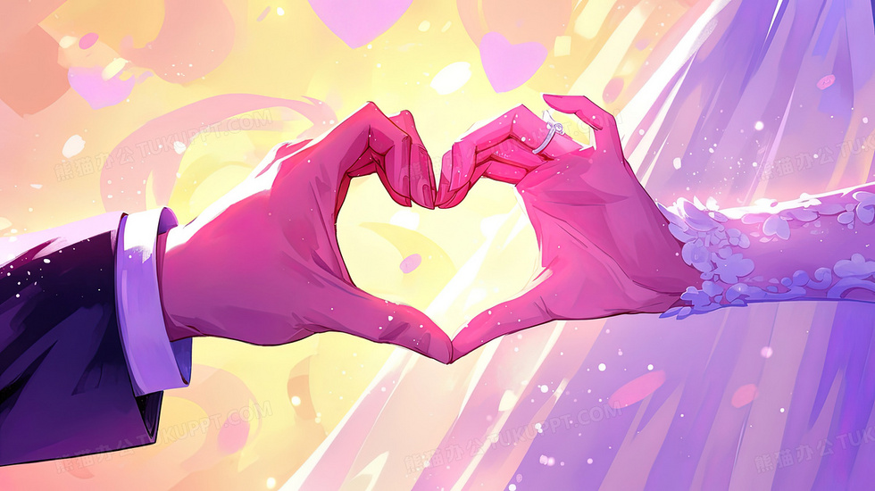 本作品内容为新婚夫妻手指比心手部特写插画, 格式为 jpg, 大小2 MB, 图片尺寸为2912 x 1632, 源文件无水印, 欢迎使用熊猫办公。 如认为平台内容涉嫌侵权,可通过邮件:tousu@tukuppt.com提出书面通知,我们将及时处理。