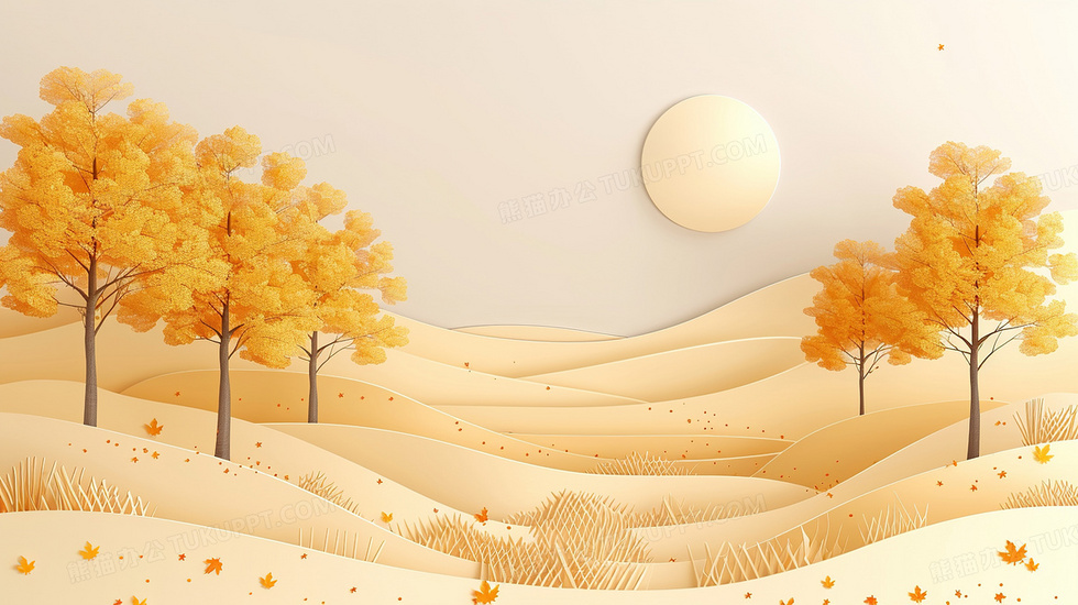 本作品内容为秋天剪纸风简约树落叶背景, 格式为 jpg, 大小3 MB, 图片尺寸为2912 x 1632, 作品中背景图片无需修改, 源文件无水印,可以直接使用, 欢迎使用熊猫办公。 如认为平台内容涉嫌侵权,可通过邮件:tousu@tukuppt.com提出书面通知,我们将及时处理。