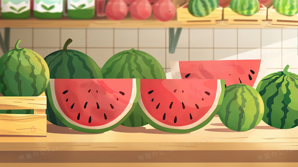 本作品内容为炎热三伏天的西瓜水果摊插画, 格式为 jpg, 大小3 MB, 图片尺寸为2912 x 1632, 源文件无水印, 欢迎使用熊猫办公。 如认为平台内容涉嫌侵权,可通过邮件:tousu@tukuppt.com提出书面通知,我们将及时处理。