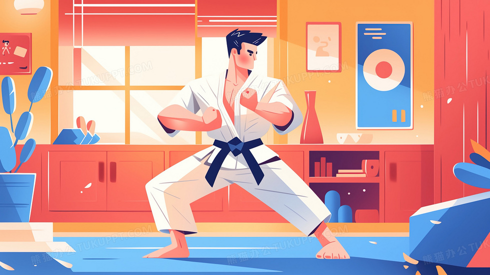 本作品内容为锻炼运动跆拳道的男子插画, 格式为 jpg, 大小2 MB, 图片尺寸为2912 x 1632, 源文件无水印, 欢迎使用熊猫办公。 如认为平台内容涉嫌侵权,可通过邮件:tousu@tukuppt.com提出书面通知,我们将及时处理。