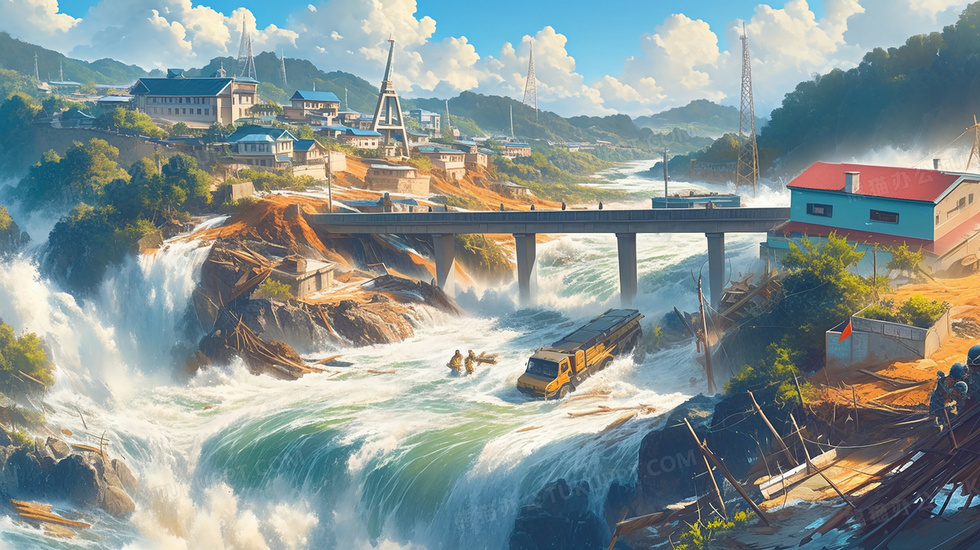 本作品内容为洪涝灾害洪水上涨冲毁村庄插画, 格式为 jpg, 大小3 MB, 图片尺寸为2912 x 1632, 源文件无水印, 欢迎使用熊猫办公。 如认为平台内容涉嫌侵权,可通过邮件:tousu@tukuppt.com提出书面通知,我们将及时处理。
