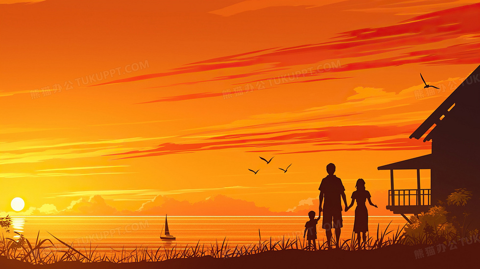 本作品内容为夕阳下一家人背影剪影插画, 格式为 jpg, 大小3 MB, 图片尺寸为2912 x 1632, 源文件无水印, 欢迎使用熊猫办公。 如认为平台内容涉嫌侵权,可通过邮件:tousu@tukuppt.com提出书面通知,我们将及时处理。
